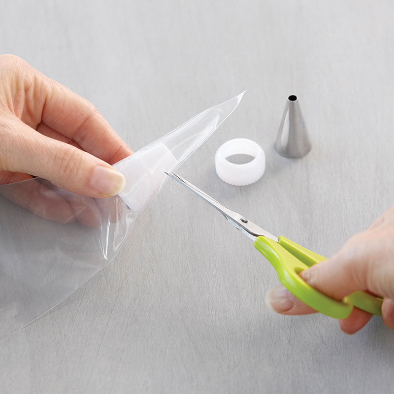 Empurre a base do acoplador para dentro da bolsa para poder cortar uma abertura na marca.