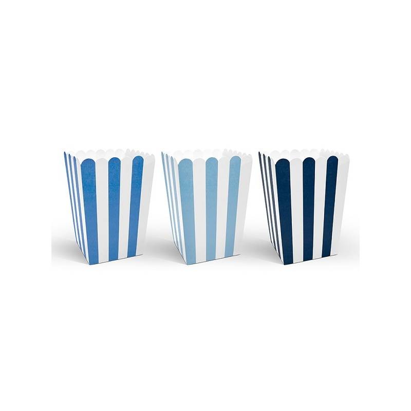 Caixinhas de pipocas de papelão com desenho de listras cor azul claro, azul e azul marinho.
