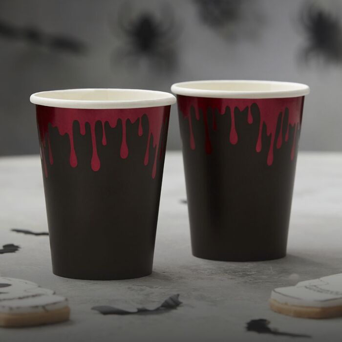 Decore sua festa de Halloween arrepiante com estes divertidos Copos de Papel de Halloween Blood Drip em preto e vermelho - ideais para dar vida à sua mesa de festa!