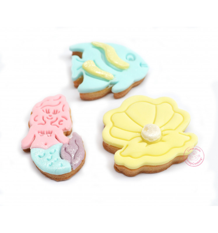 Conjunto de 3  sereia - ideal para fazer sereias, peixes e conchas em decoração de pasta de açúcar e biscoitos, e para decorar suas sobremesas. Esses cortadores de biscoito fáceis de usar têm um ejector que permite empurrar a pasta de açúcar facilmente.