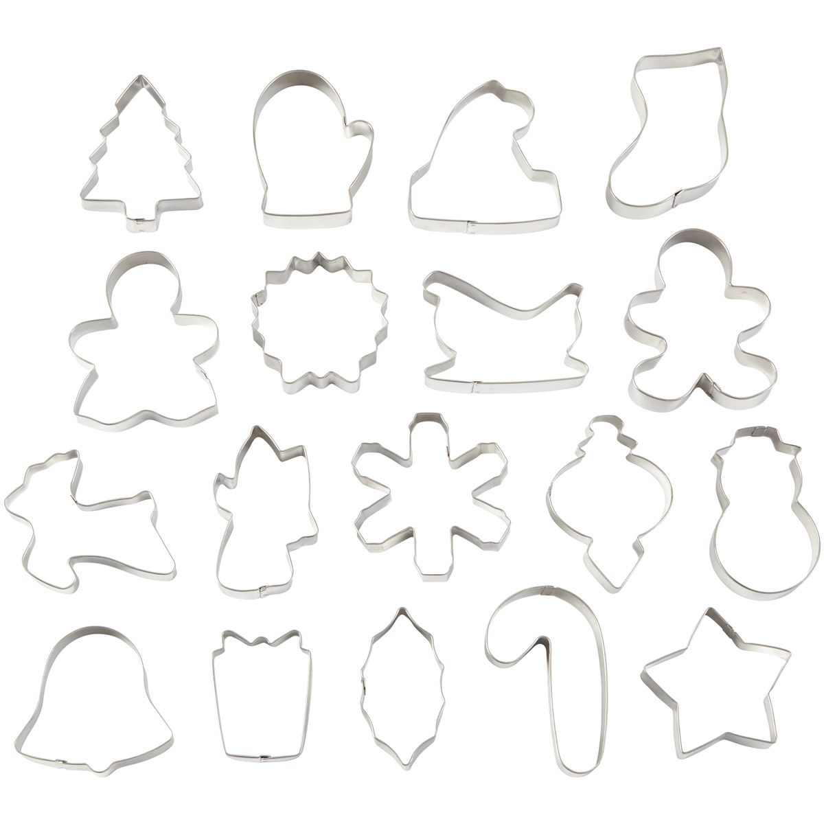 Este conjunto contém os seguintes cortadores: floco de neve, folha de azevinho, menina de gengibre, estrela, trenó, árvore, meia, boneco de neve, rena, ornamento, bengala de doces, chapéu de pai natall, anjo, sino, presente, grinalda, menino de gengibre e luva.