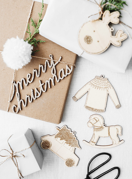 Decorações de madeira  com glitter dourados de um lado. O conjunto contém 10 peças (5 modelos, 2 peças de cada modelo) e 2 m de fio de juta, tamanho  de aprox. 6,5-10 x 7-8,5 cm.