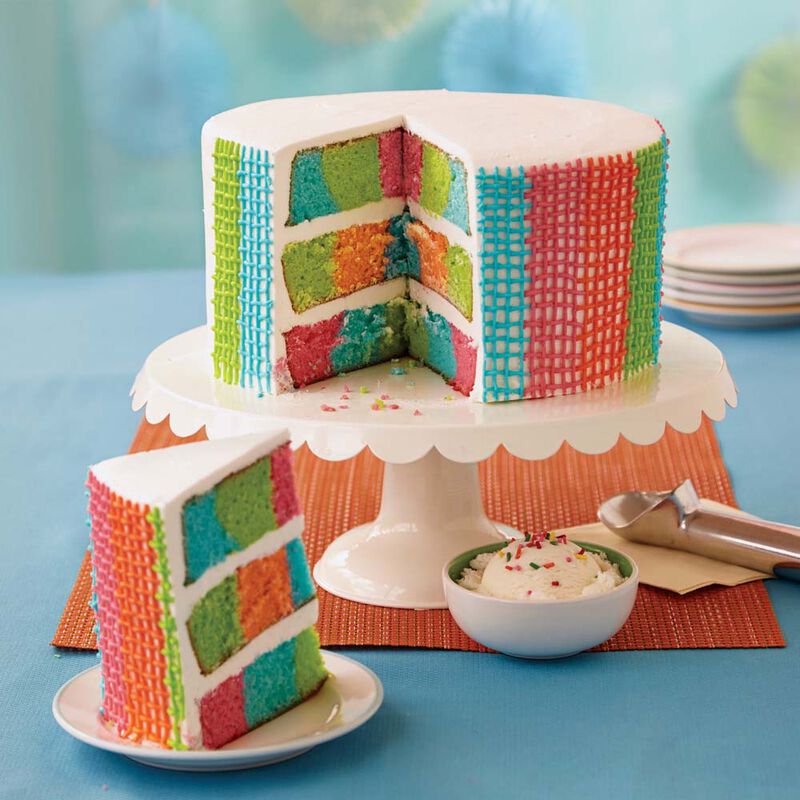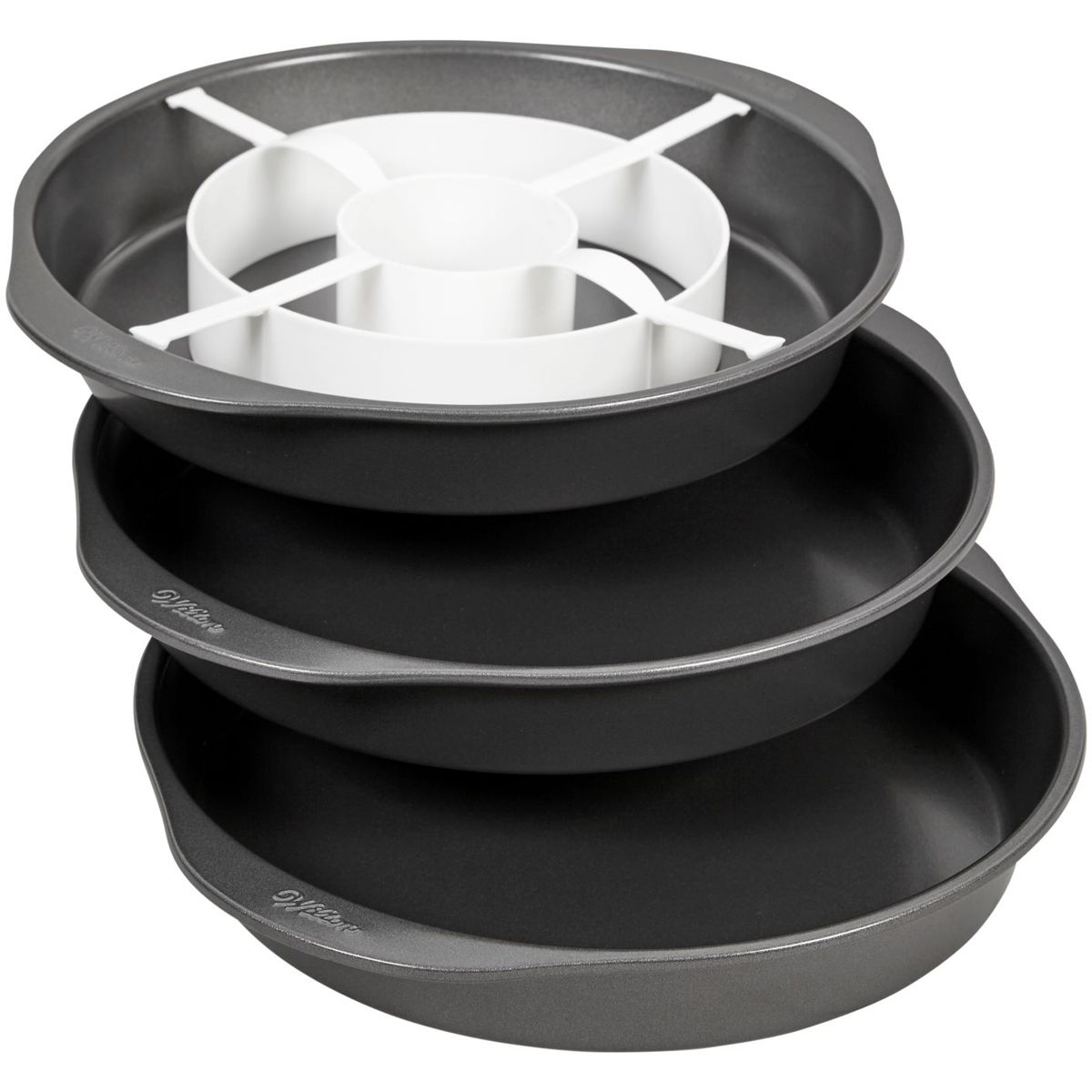 Este conjunto único de formas fará com que cada pedaço de bolo pareça uma obra de arte multicolorida. É simples e funciona. O anel separador divide a massa de bolo em diferentes seções da forma. As 3 formas têm 22,5 cm de diâmetro e 3,8 cm de profundidade. Usando todas , você pode criar 3 camadas. O conjunto contém instruções em inglês. O conjunto contém 3 formas com revestimento antiaderente e 1 anel separador de plástico. Não recomendado maquina loiça.