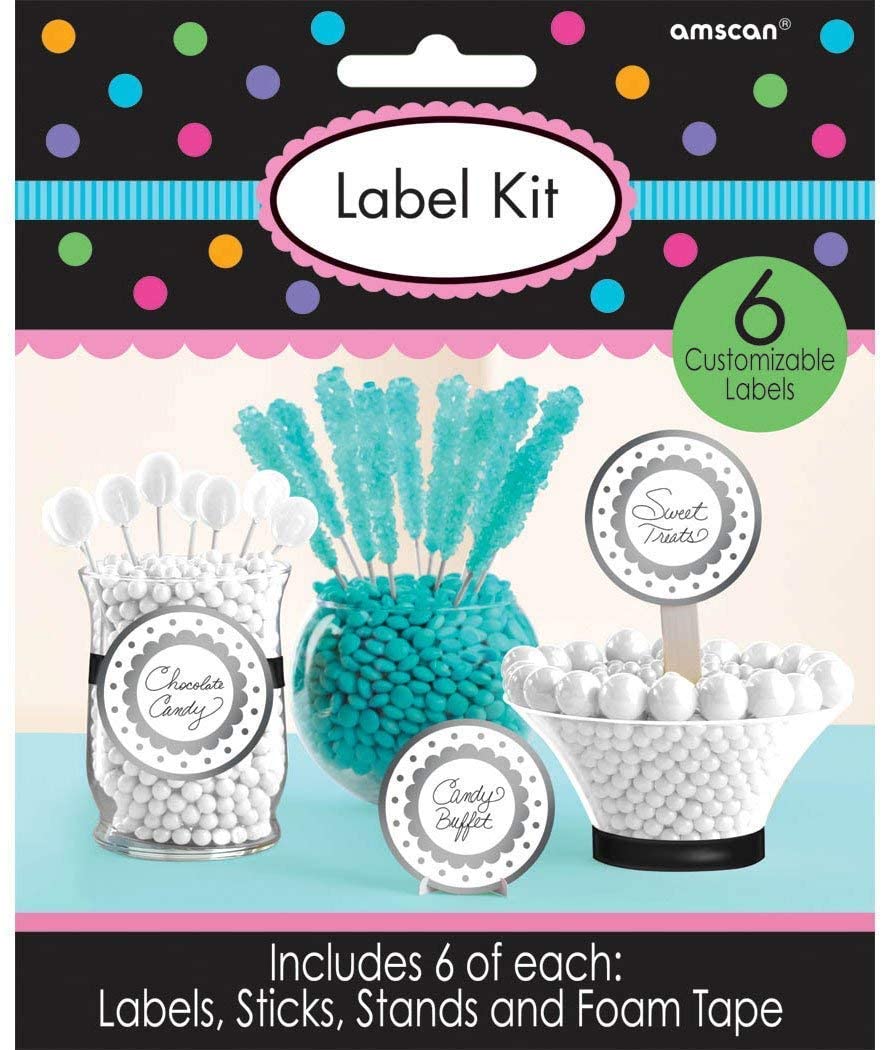 Embalagem de kit de etiquetas personalizáveis para festa da amscan com cores preta, azul, rosa e pontos coloridos