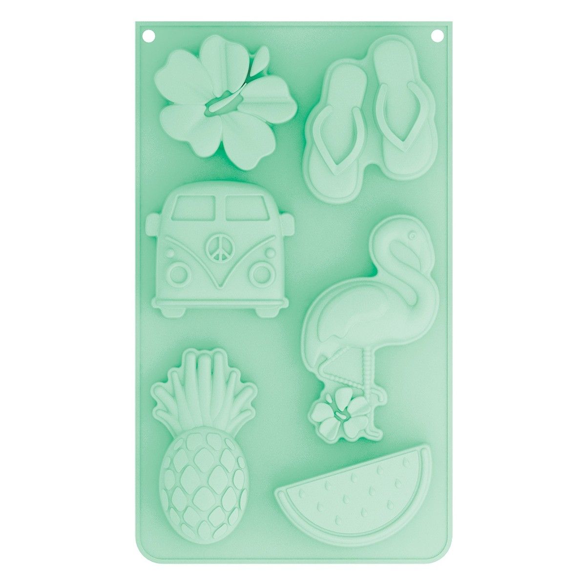 Use este molde de silicone para fazer 6 bolos com o tema do verão - van, flor, chinelos, abacaxi, melancia e flamingo rosa.
