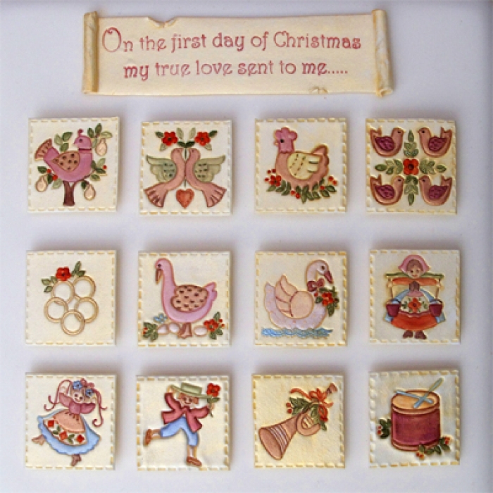 Cada design pode ser usado individualmente ou em conjunto, conforme mostra na imagem. Inclui uma gravação 'No primeiro dia de Natal, meu verdadeiro amor me enviou .....'.