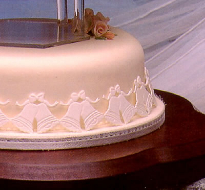 Este cortador corta três tamanhos diferentes de sinos. Os sinos maiores podem ser usados na camada inferior, o tamanho médio na camada intermediária e os menores na camada superior. Eles também podem ser usados em bolos pequenos. Tente adicionar algumas flores pequenas no topo, sob o arco.