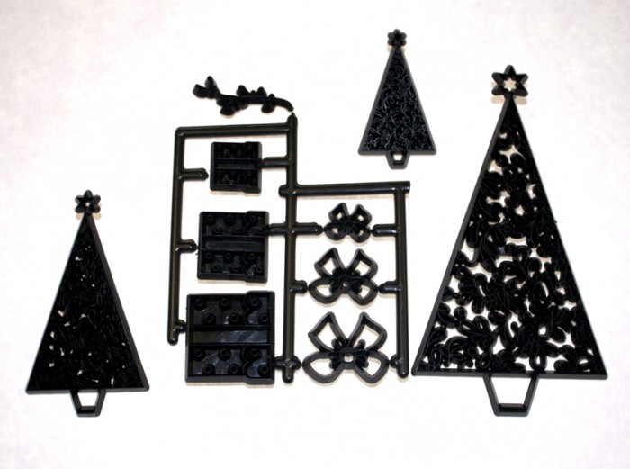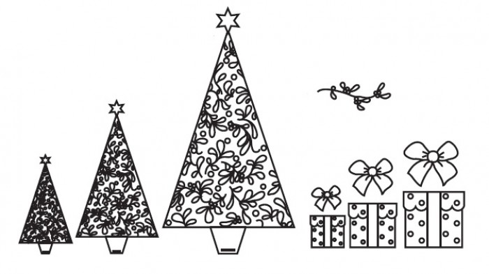 Este conjunto contém três tamanhos de árvores, pacotes, arcos e um cortador de visco. As árvores têm uma forma moderna e ficam ótimas em cores brilhantes.