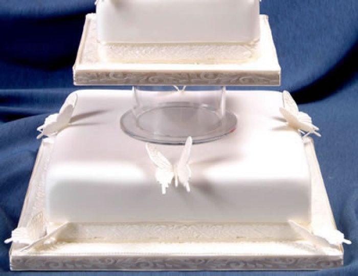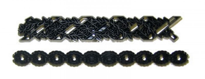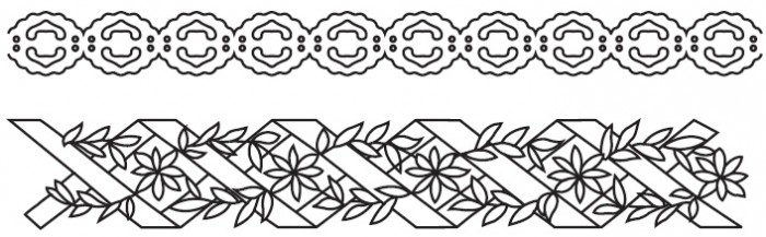 Este conjunto contém dois cortadores de tiras de renda. Ambas as tiras podem ser utilizadas para decorar a lateral de um bolo. A faixa mais estreita tem pequenos pedaços que podem ser removidos para dar uma aparência rendada.