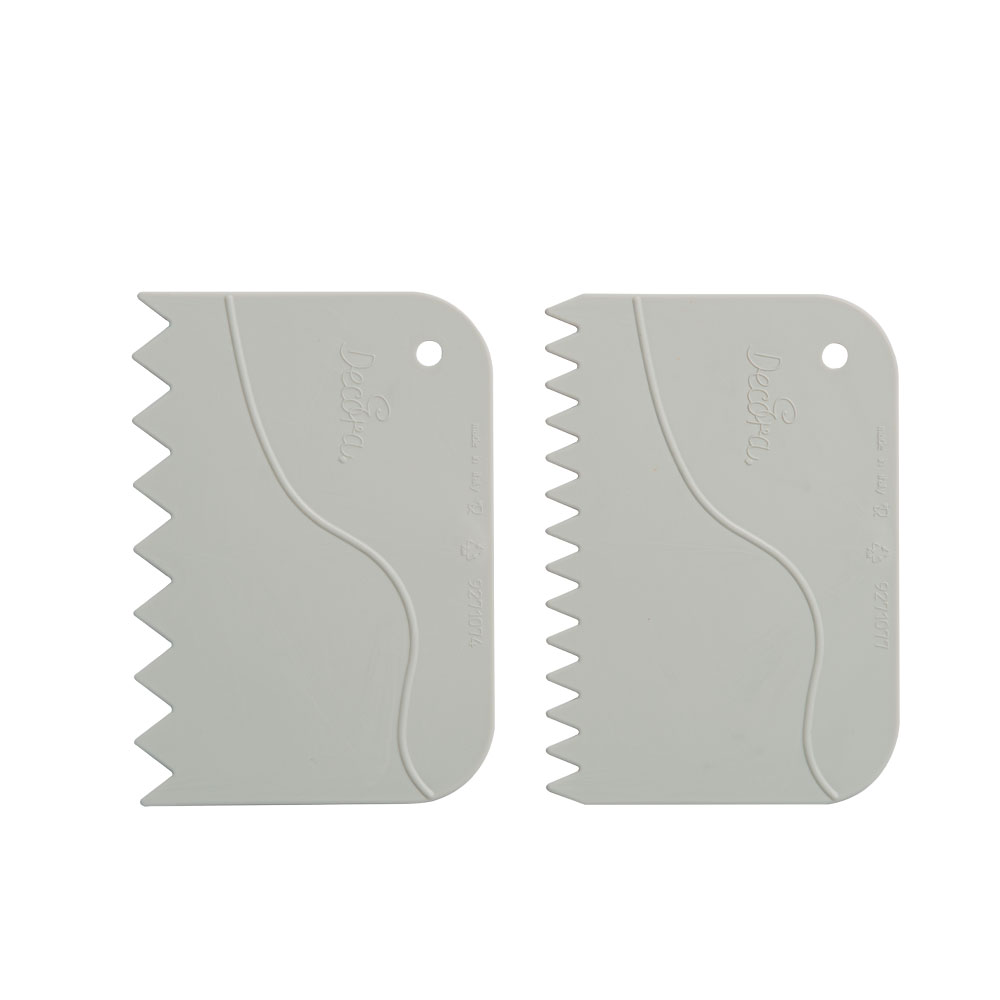 Espátulas de plástico essenciais para o processamento de cremes, chantilly e chocolate. A extremidade dentada permite um acabamento perfeito do bolo. O pacote contém 2 espátulas de 12 x 8,3 cm e 13,5 x 9,2 cm.